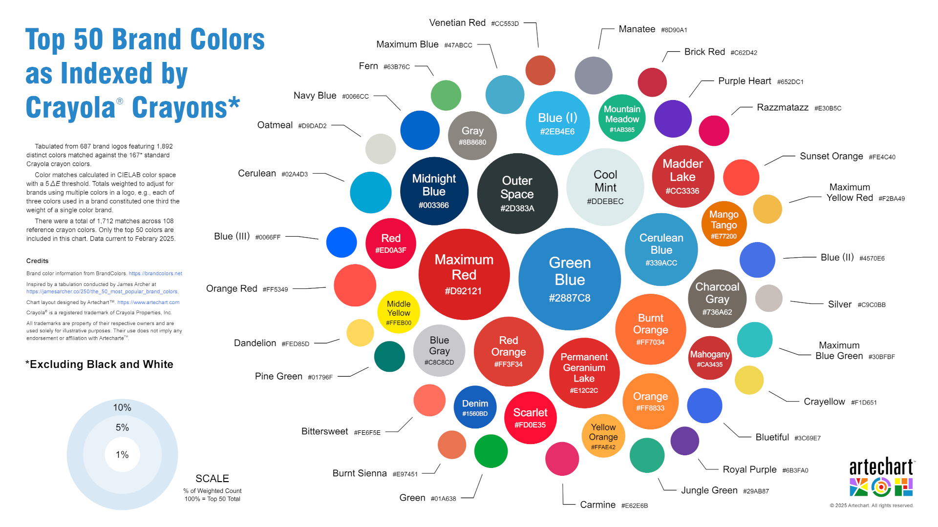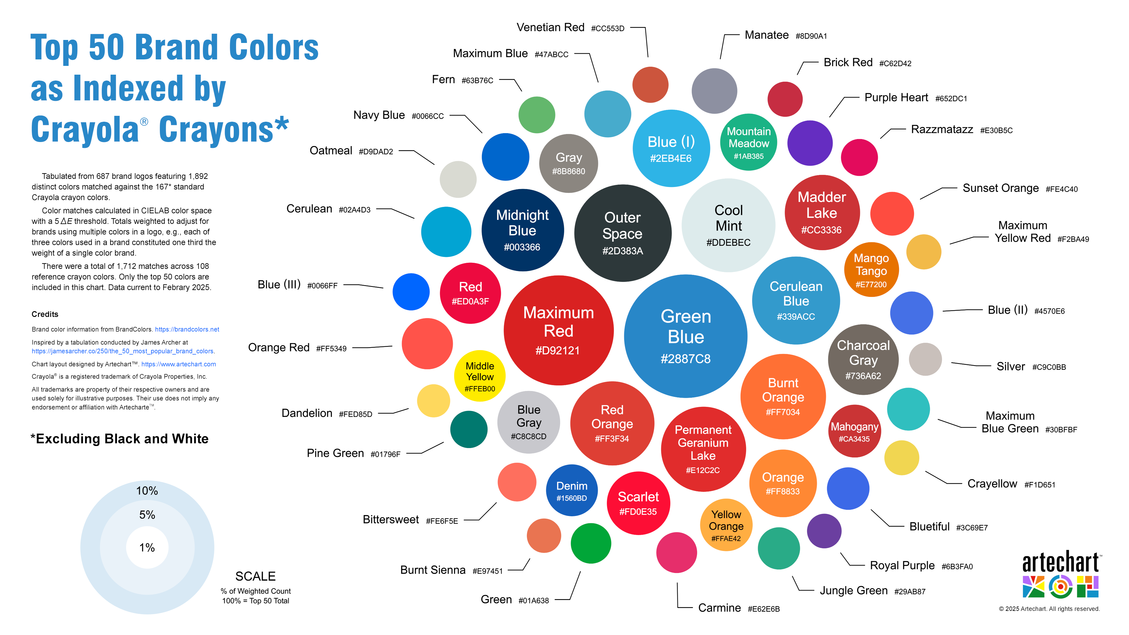 Tabulated from 687 brand logos featuring 1,892 distinct colors, excluding Black (#00000) and White (#FFFFFF). Matched against the 167 historical standard Crayola crayon colors (https://en.wikipedia.org/wiki/List_of_Crayola_crayon_colors), again not counting black and white.